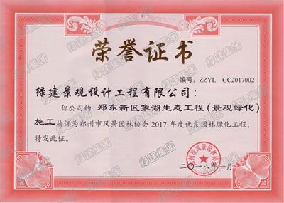 鄭東新區(qū)象湖榮獲鄭州市風(fēng)景園林協(xié)會(huì)2017年度優(yōu)良園林綠化工程