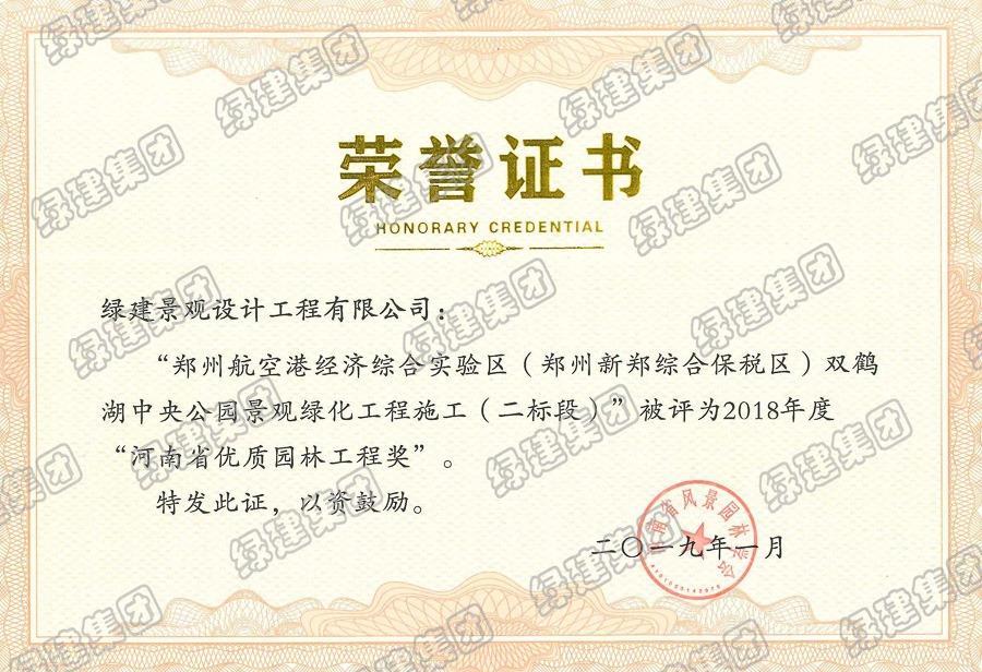 雙鶴湖二標榮獲2018年度河南省優質園林工程獎