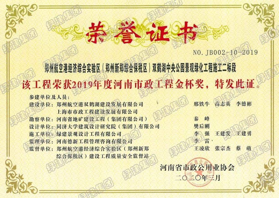 雙鶴湖二標榮獲2019年度河南市政工程金杯獎