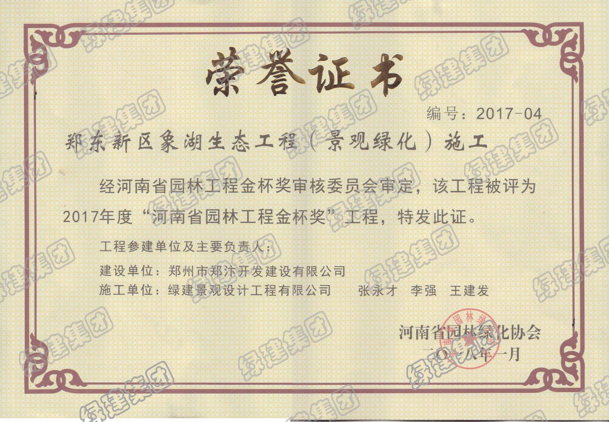 鄭東新區象湖榮獲2017年度河南省園林工程金杯獎工程
